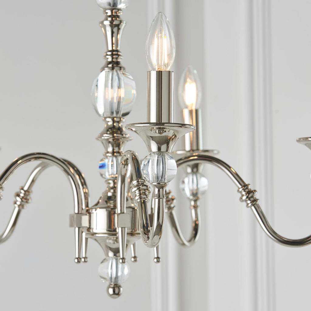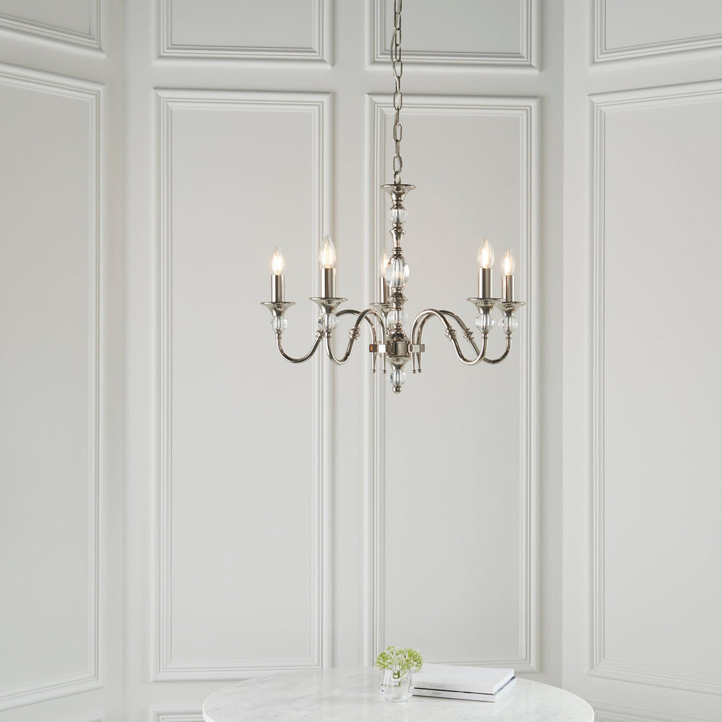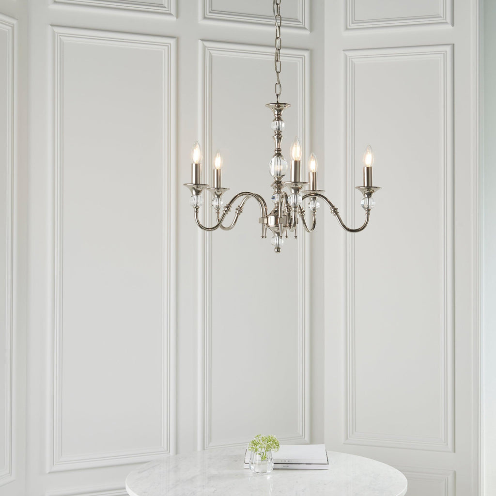 This Polina 5 Light Chandelier from Interiors 1900 is a beautiful traditional chandelier with a stunning polished nickel finish which is complemented by the clear crystal glass spheres. The Polina range offers a vast choice of ceiling lights, as well as wall lights, table and floor lamps, and a choice of polished nickel or antique brass finishes, and many of the lamps are available with or without shades.