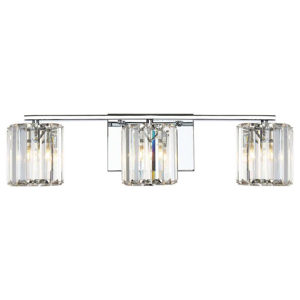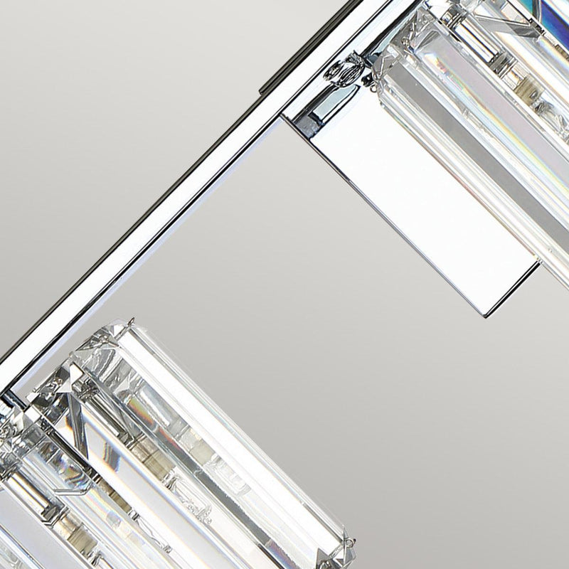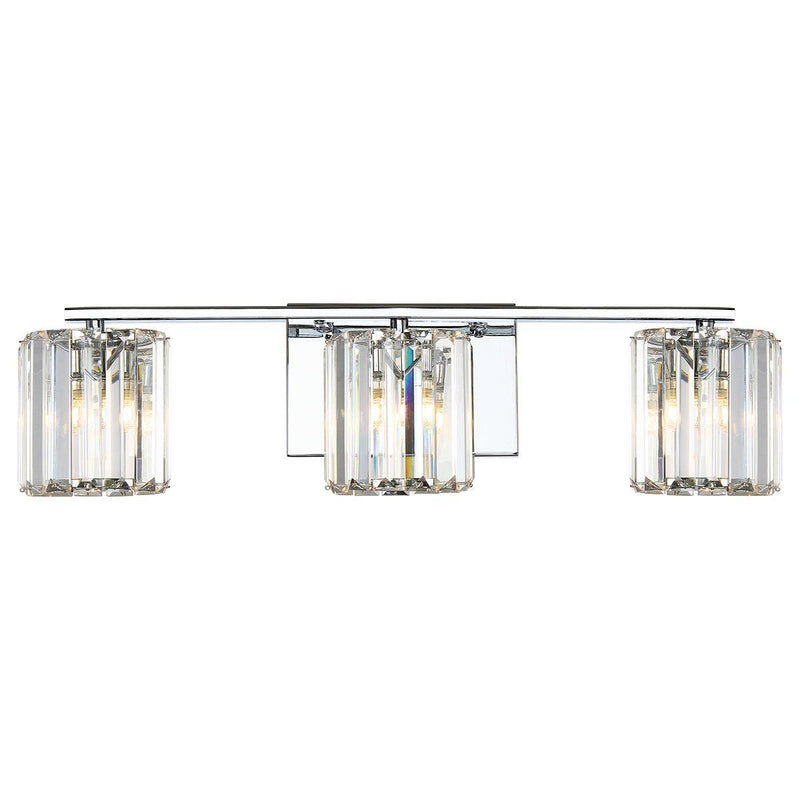 The Divine 3 light Wall light, is exquisite sophistication, the simple backplate gleams in Polished Chrome and reflects every cut and sparkle of the crystal-glass. The refractive glass is arranged in slats pinned top and bottom to form a shade around the LED bulb. IP44 bathroom rated.