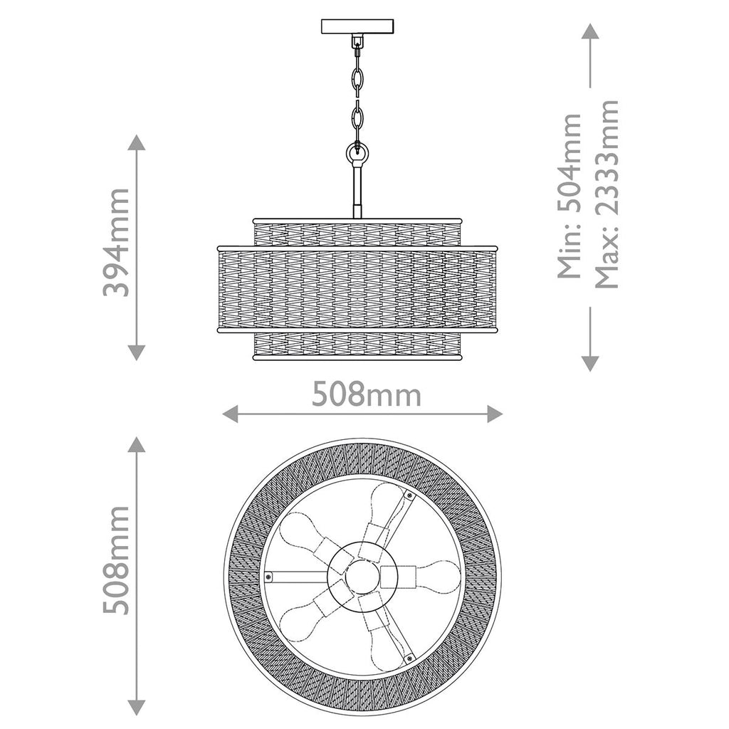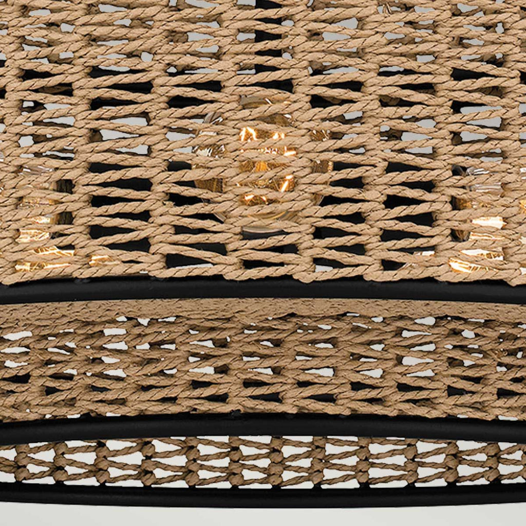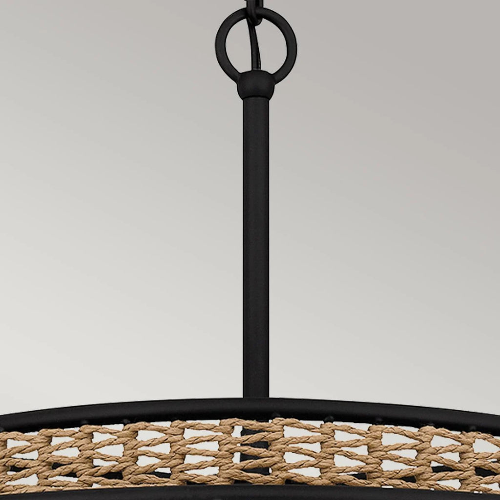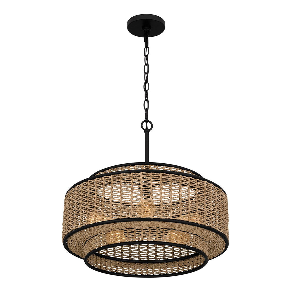 Enhance your living room or bedroom with the Quoizel Teton Black 5 Light Ceiling Pendant. This striking pendant blends global inspiration with natural elegance, featuring a timeless drum silhouette finished in sophisticated matte black. The layered design is enhanced by a natural rope shade, adding depth, texture, and a subtle coastal charm to any room. Shop with confidence from the UK’s leading lighting specialists and enjoy free 90-day UK returns.| Adjustable Drop | 233.3cm/91.9" |