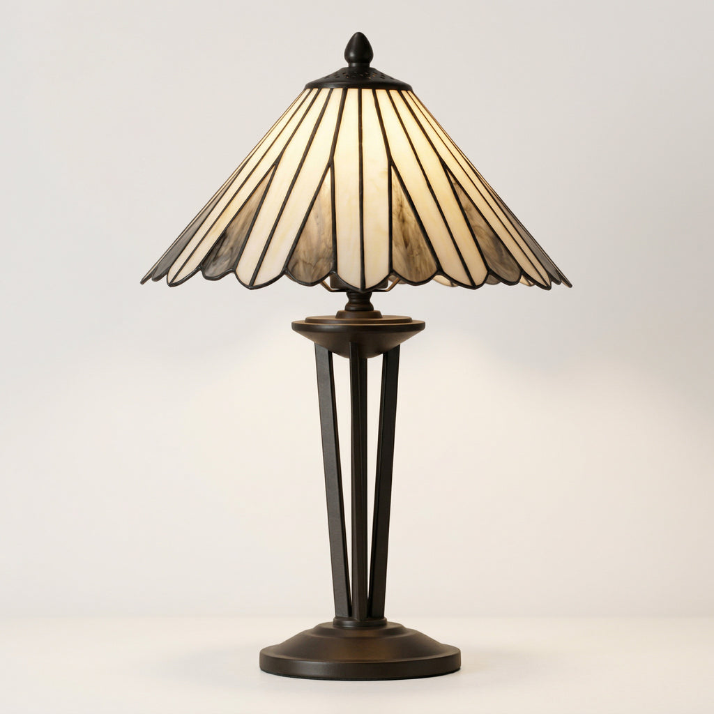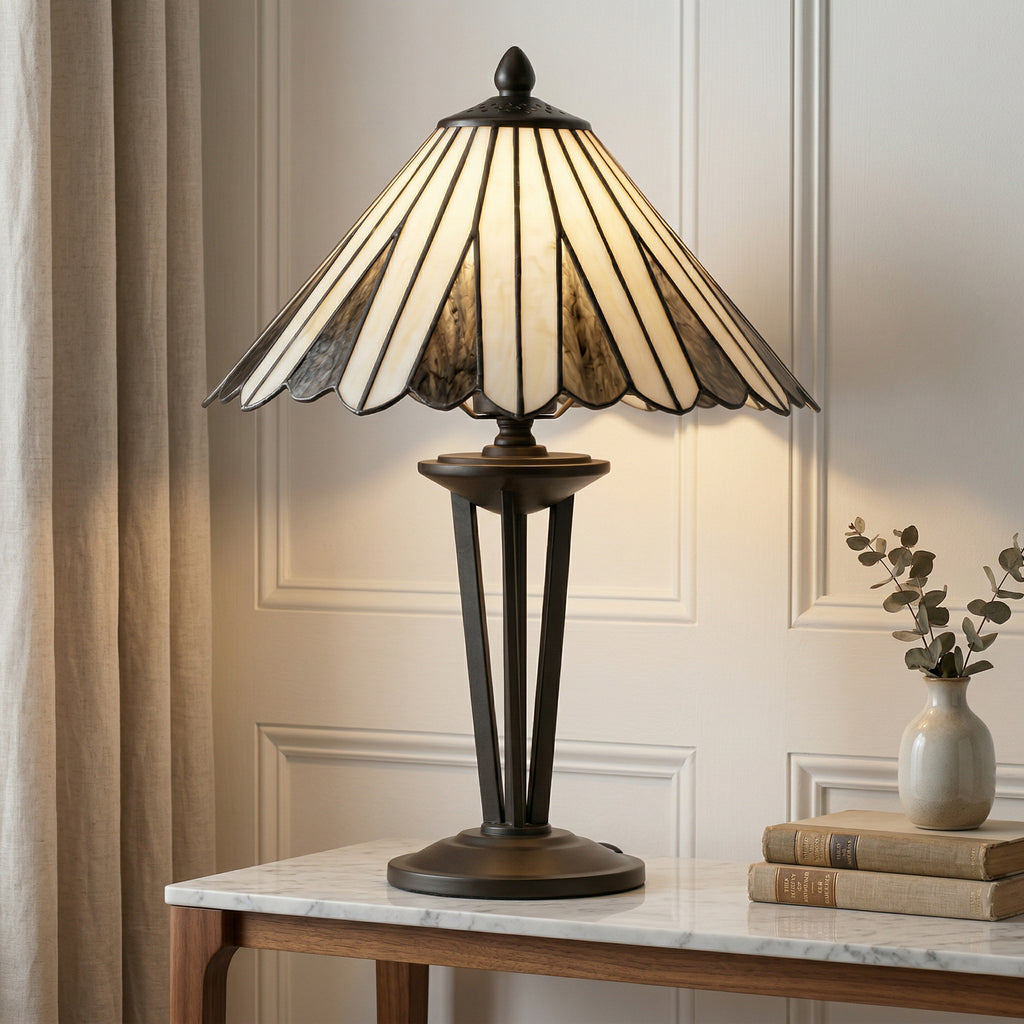 The Regan Medium Tiffany Table Lamp is a stunning blend of classic design and intricate craftsmanship. Standing at 48cm (19") tall with a 31cm (12") diameter, this lamp is the perfect size to add a touch of sophistication to your living room, bedroom, or study.
