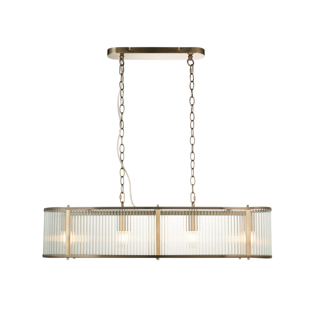 Timeless classic linear pendant with antique brass plated metalwork, the clear ribbed glass panels shade and diffuse the light. Height adjustable chain means this can be perfectly placed to illuminate dining rooms and living spaces. Matching flush and pendant lights are also available to create a co-ordinated look.