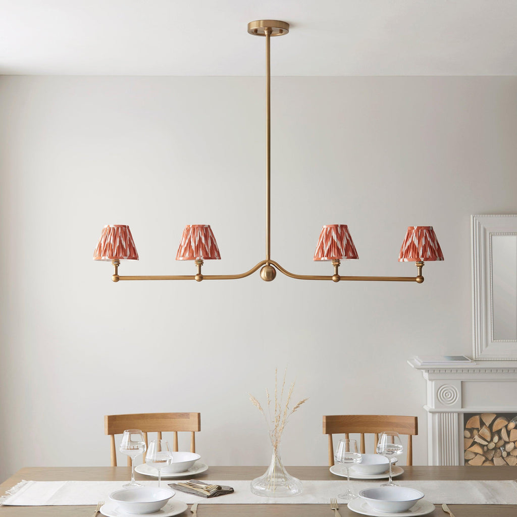 An elegant 4 light classic pendant with multiple stem height options, finished in brushed aged brass and featuring B22 lamp holders for an authentic feel. This unique linear pendant with beautiful sphere detail is best positioned over dining tables; finished with four of our bright apricot orange 16cm Zigzag shades, helping to create a timeless look.| Adjustable Drop | 121.5cm/47.8" |