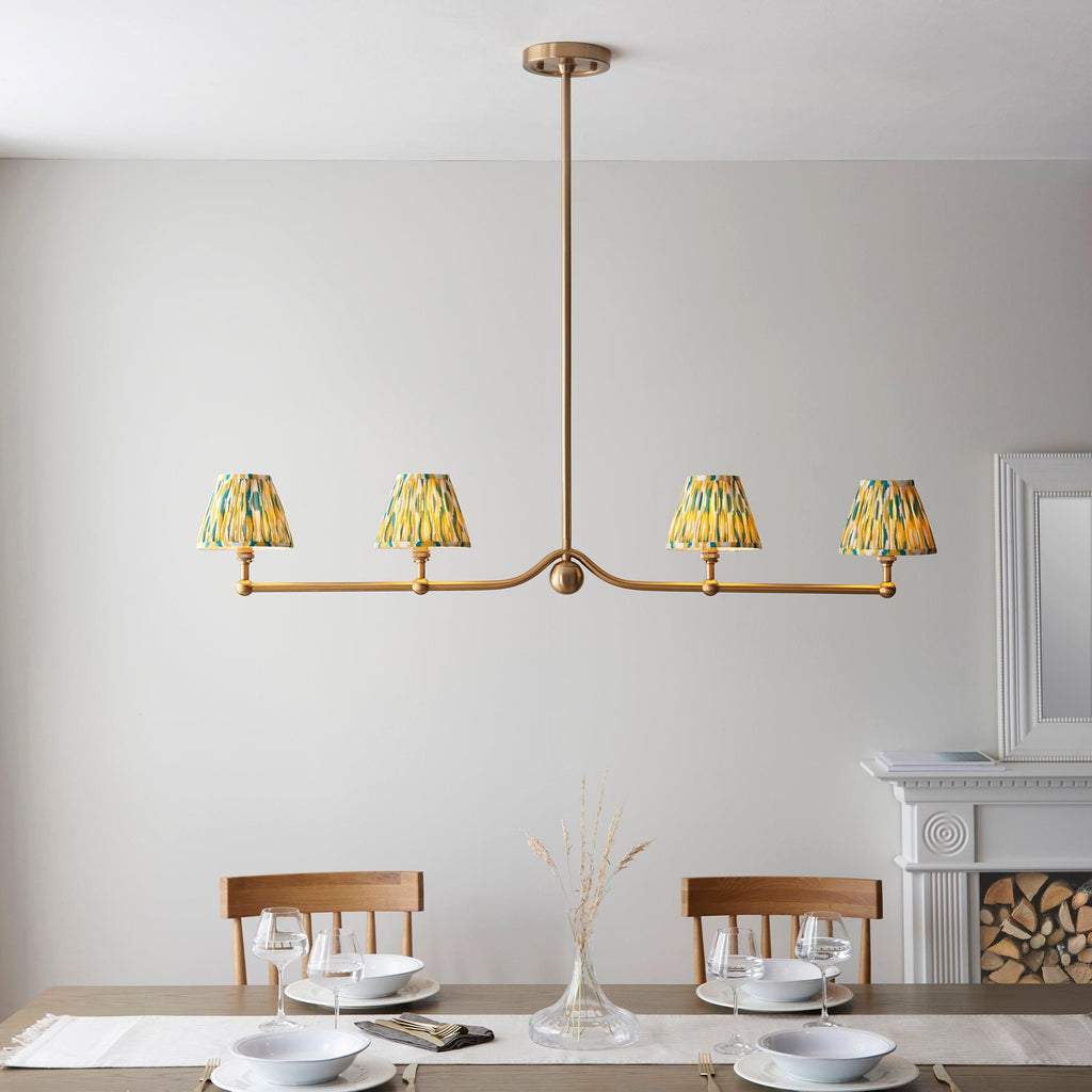 An elegant 4 light classic pendant with multiple stem height options, finished in brushed aged brass and featuring B22 lamp holders for an authentic feel. This unique linear pendant with beautiful sphere detail is best positioned over dining tables; finished with four of our vibrant yellow & jade 16cm Ikat shades, helping to create a timeless look.| Adjustable Drop | 121.5cm/47.8" |
