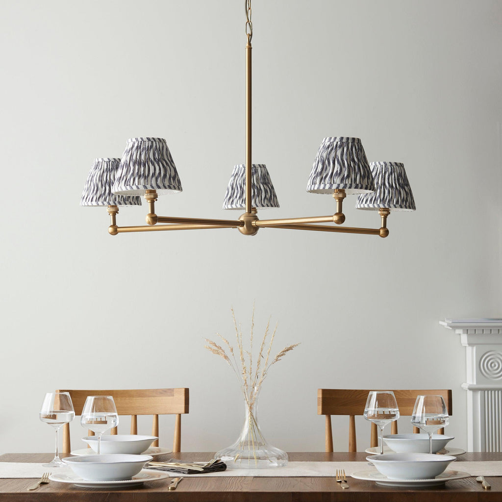 Illuminate your space with timeless elegance and sophistication with our exquisite 5-light classic pendant. Designed to captivate and inspire, this stunning fixture features authentic B22 lamp holders, offering a touch of vintage charm that seamlessly blends with modern aesthetics. Crafted with meticulous attention to detail, the pendant is finished in luxurious brushed aged brass, exuding a warm, inviting glow. Its height-adjustable 1.5m chain, adorned with a chic grey braided fabric flex, allows you to customize the perfect ambiance for any room. The pièce de resistance? Our stylish pearl grey 20cm Ripple shades, which add a refined touch to complete the look. Plus, for those who value energy efficiency without compromising on style, this pendant is compatible with LED lamp bulbs, ensuring a sustainable and long-lasting lighting solution. Transform your home into a haven of elegance and charm. Elevate your lighting experience today with this captivating pendant.| Adjustable Drop | 214cm/84.3" |