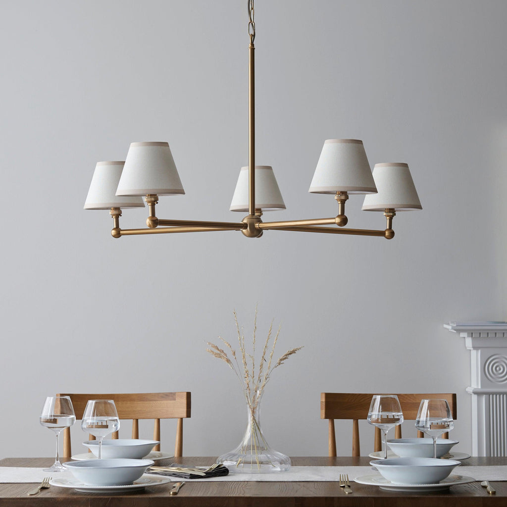 Illuminate your space with timeless elegance and sophistication with our exquisite 5-light classic pendant. Designed to captivate and inspire, this stunning fixture features authentic B22 lamp holders, offering a touch of vintage charm that seamlessly blends with modern aesthetics. The pendant is beautifully finished in brushed aged brass, exuding a warm, inviting glow that enhances any room's ambiance. Suspended from a height-adjustable 1.5m chain, this pendant allows you to customize the drop to perfectly suit your space. The grey braided fabric flex adds a subtle touch of texture, enhancing the overall design. Completing the look are our vintage and almond white 16cm Ivy shades, which provide a soft, diffused light that creates a cozy and welcoming atmosphere. For added convenience and energy efficiency, this pendant is compatible with LED lamp bulbs, allowing you to enjoy brilliant illumination while saving on energy costs. Transform your home with this elegant lighting solution and experience the perfect blend of classic style and modern functionality. Don't miss the opportunity to elevate your décor—order now and let your space shine with timeless beauty.| Adjustable Drop | 214cm/84.3" |