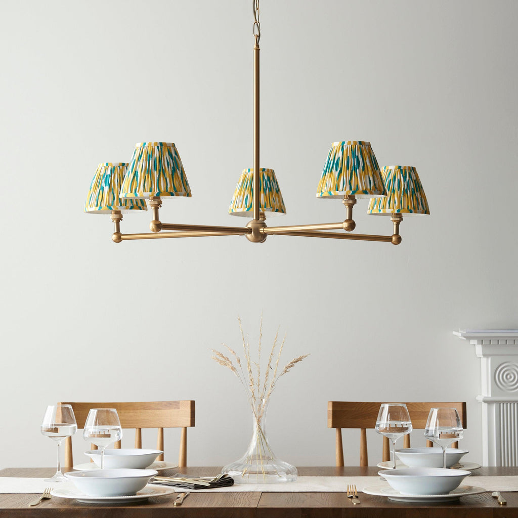 Santiago Brass 5 Light Pendant Ceiling Light With Yellow & Jade Ikat 16cm Shades