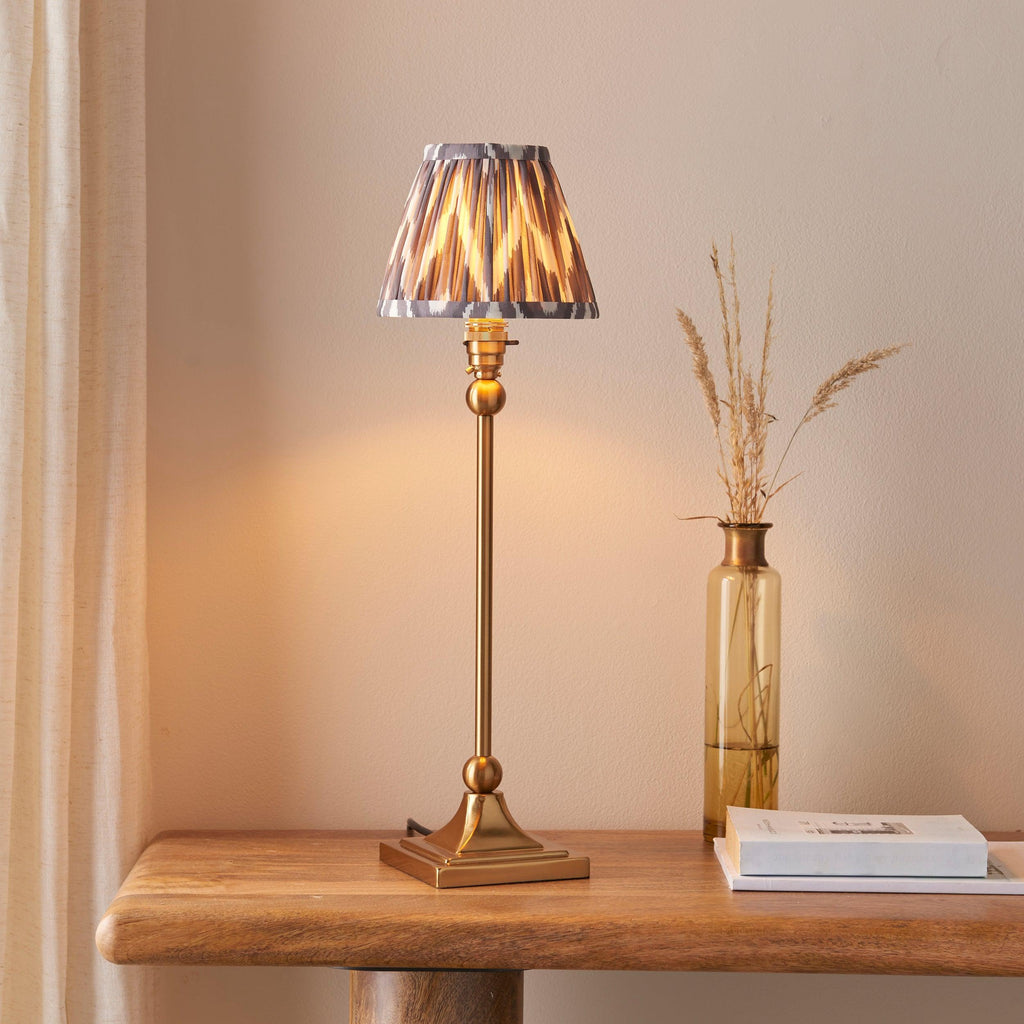 Illuminate your space with sophistication and style with our exquisite table light, designed to captivate and enhance any room. Featuring an authentic switched B22 lamp holder, this piece is elegantly finished in brushed aged brass, exuding timeless charm and luxury. The grey braided fabric flex adds a touch of modern elegance, seamlessly blending with any decor. Paired with our chic pearl grey 16cm Zigzag shade, this table light is not just a source of illumination but a statement piece that completes your interior design. Plus, it's compatible with energy-efficient LED lamp bulbs, offering you the perfect blend of style and sustainability. Transform your living space with this stunning table light and experience the perfect harmony of classic elegance and contemporary design. Don't miss the opportunity to elevate your home—order now and let your space shine with unparalleled beauty.| Height | 52cm/20.5" |