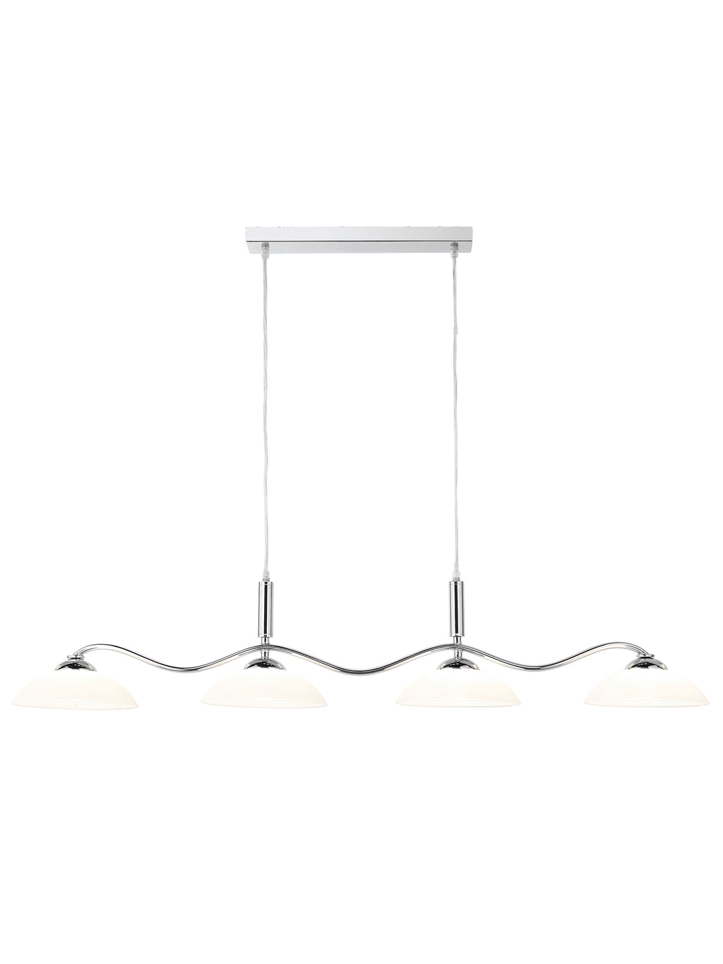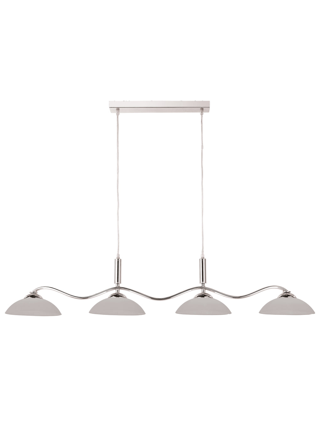 This Alexis chrome 4 light bar pendant with frosted glass shades is modern, stylish and incredibly easy on the eye. The four domed frosted glass shades are attached to a sleek wavy chrome finish bar, which is connected to a stylish double wire suspension. And it provides a contemporary lighting effect for any breakfast bar or dining area. LED's use up to 75% less energy and last up to 20 times longer than incandescent bulbs.| Height | 130cm/51.2" |