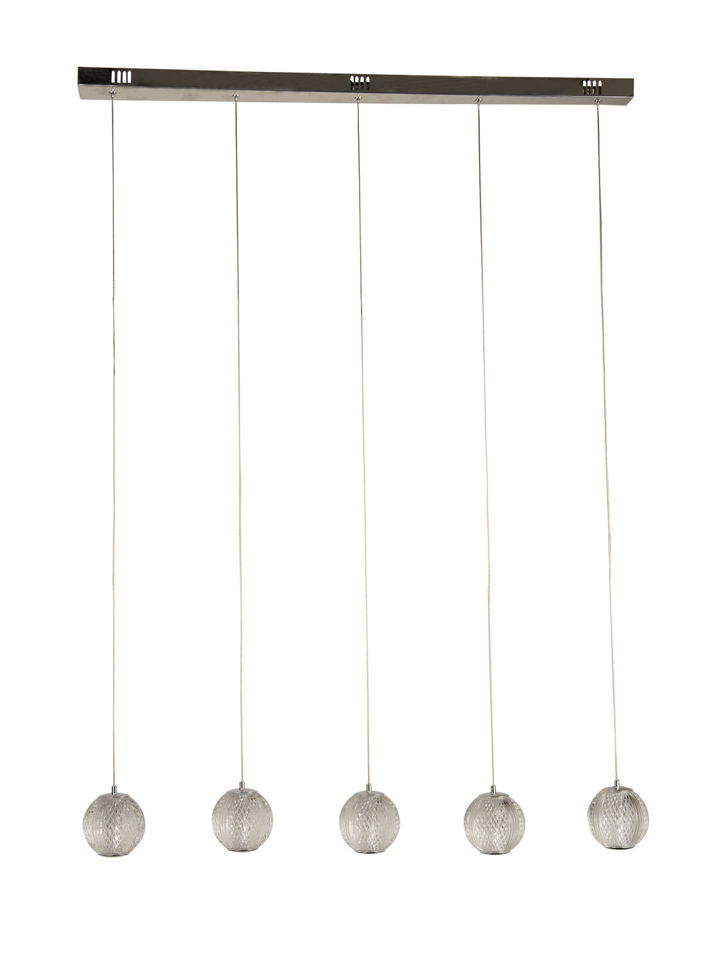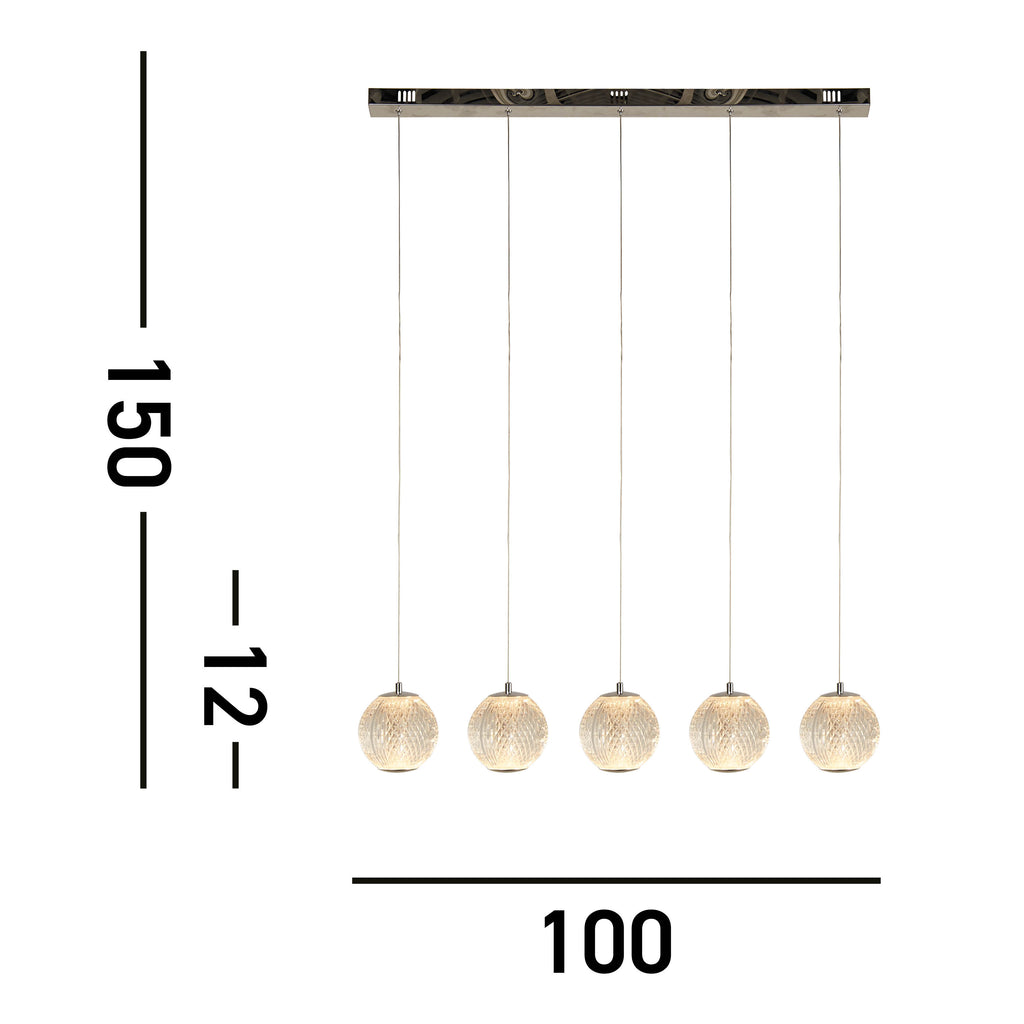 Whether you desire focused lighting or a more ambient glow, this pendant provides versatility to create the perfect atmosphere. The height adjustable Allure 5 light Bar Pendant features five globe-shaped shades crafted from textured acrylic, creating a visual masterpiece even when the light is turned off. The textured surface adds depth and character to the shade, making it a striking focal point that complements various decor styles. Ideal for a living room, hallway or even hung low over a dining table or kitchen island, this 5 light bar pendant will add sophistication to any home.| Height | 150cm/59.1" |