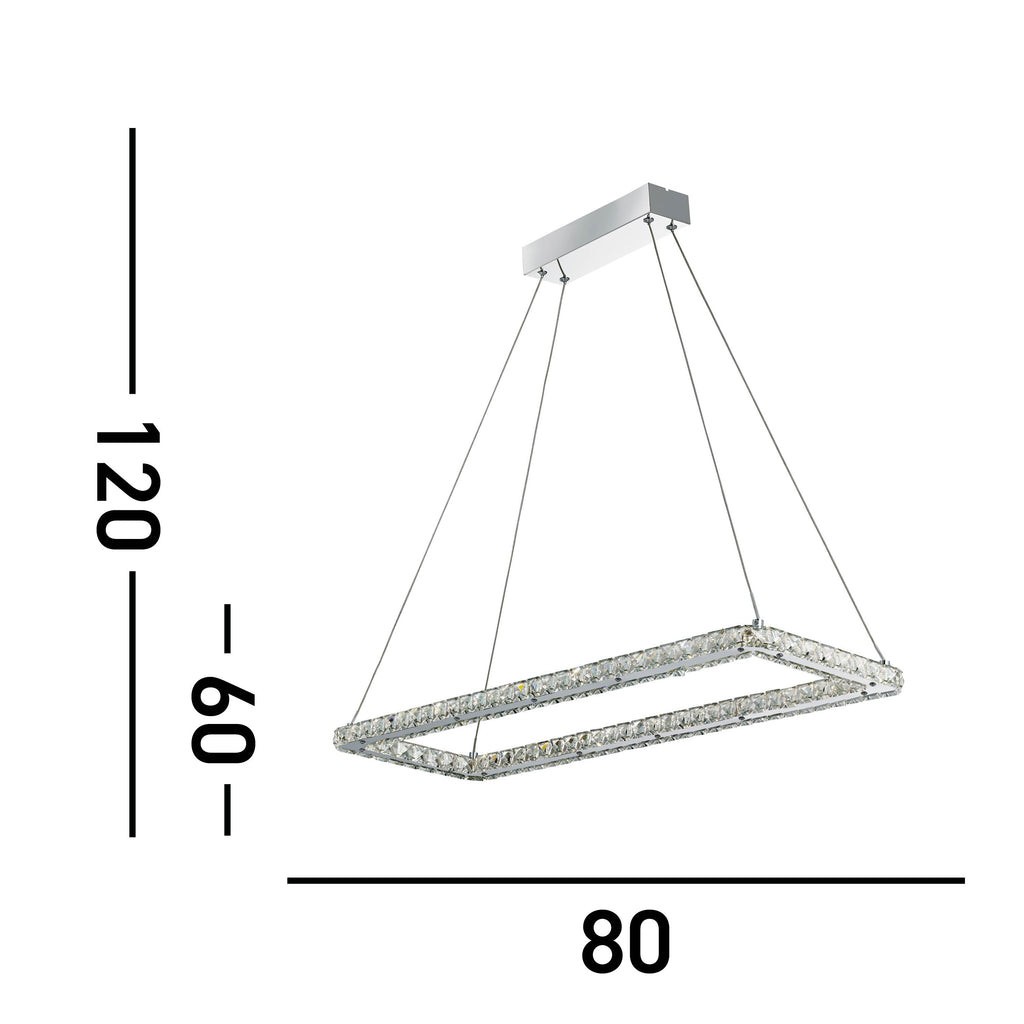 Crafted using chrome and clear glass pieces, this stunning ceiling pendant will add instant glamour to any room. The eye-catching rectangular shaped pendant suspends from a chrome rectangular ceiling plate, creating a stunning pendant, ideal for any living room, bedroom or hallway.| Height | 120cm/47.2" |