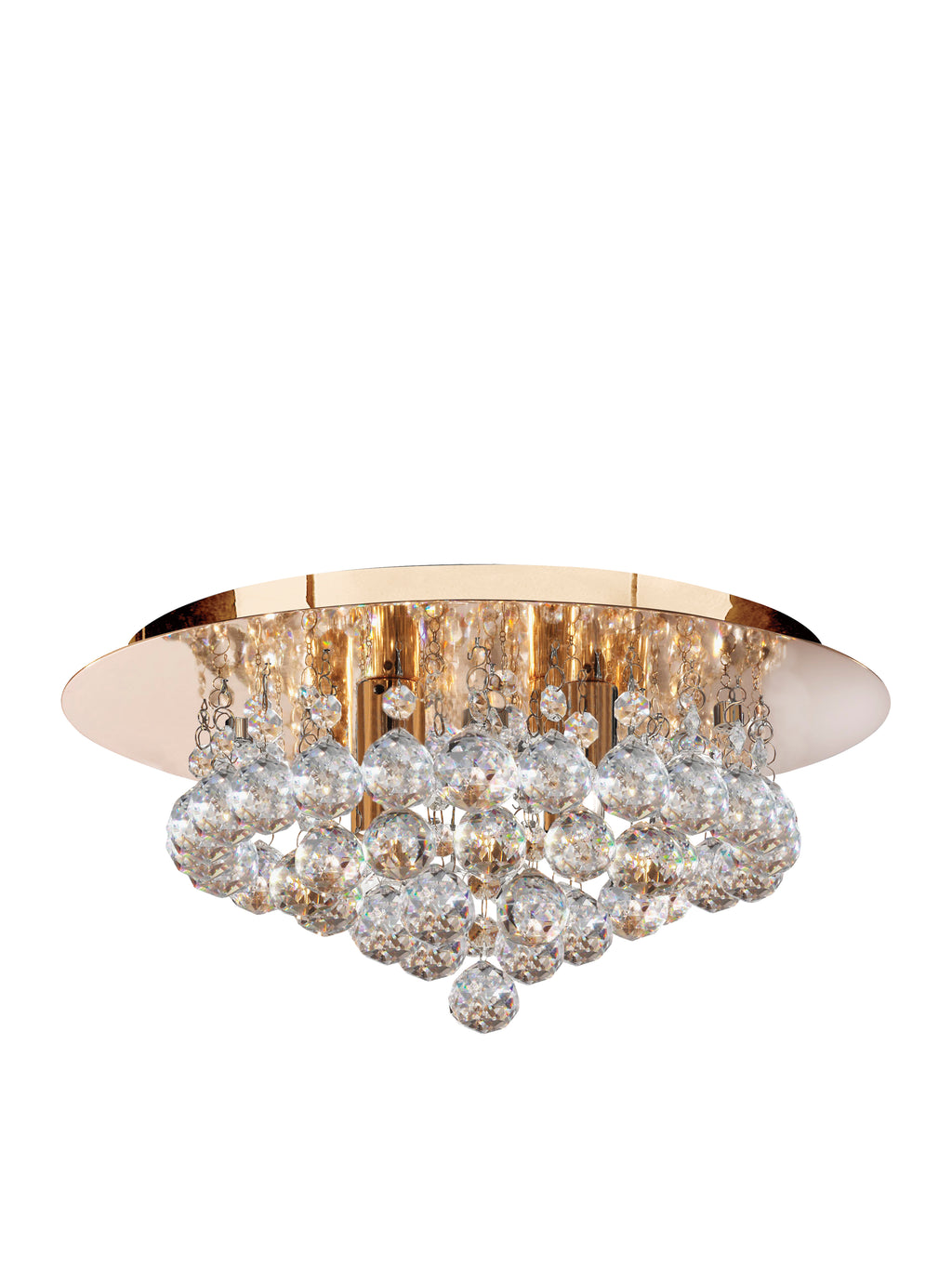 This Hanna gold 4 light ceiling fitting with clear crystal balls looks dramatic on any ceiling. The luxurious light fits flush to the ceiling and features four lamps surrounded by decadent crystal trimmings and balls. And the elegant gold finish, with gold mirrored backplate, completes the look of this modern chandelier.| Projection | 17.5cm/6.9" |