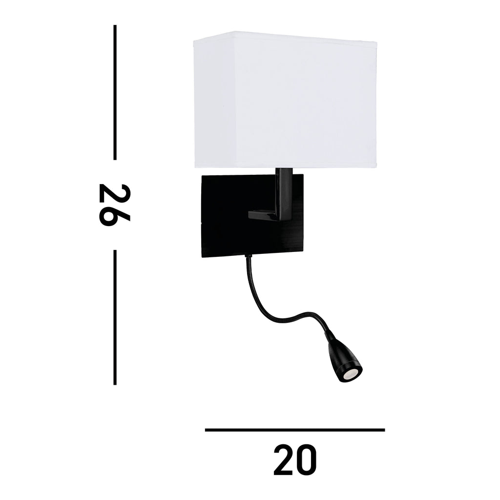 The Hotel Wall Light with LED Reading Light is a sophisticated and functional lighting fixture that brings a touch of elegance to any space. Crafted with a combination of mild steel, fabric, and plastic, this wall light is designed to withstand daily use while exuding a sense of refined style. The sleek black colour adds a modern and timeless appeal, making it suitable for both traditional and contemporary interiors. The Hotel LED Wall Light offers adjustable functionality through the LED reading light, allowing the direction of light to be changed according to needs. Integrated LED technology ensures energy efficiency and long-lasting performance, while the rocker switch allows for easy control and convenience. The box-style shade of the Hotel LED Wall Light adds a contemporary touch to its design.| Projection | 26cm/10.2" |