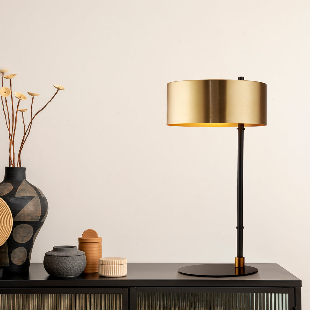 In a compact design, the Knox Table Lamp radiates elegance and functionality. It offers a sophisticated touch to any room or surface with its matt black and gold colour combination. Its opulent painted satin drum-shaped shade creates a simple yet incredibly stylish addition to any contemporary living area or bedroom. This modern table lamp adds a stunning focal point to your room and enhances any space.| Height | 49cm/19.3" |