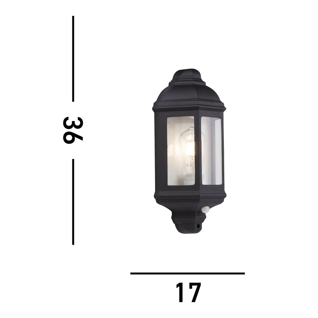 The Maine outdoor wall light is in a lantern style, and is designed to give a stylish finish to any garden, outdoor space or balcony whilst offering the safety aspects of outdoor lighting. Featuring a black finish and exposed glass shade, The Maine outdoor wall light will look great placed outside any home. Its IP44 rating means this outdoor light can withstand the elements. With the addition of a PIR sensor to detect movement, this outdoor wall light also offers the safety aspect of detecting movement.| Projection | 10cm/3.9" |