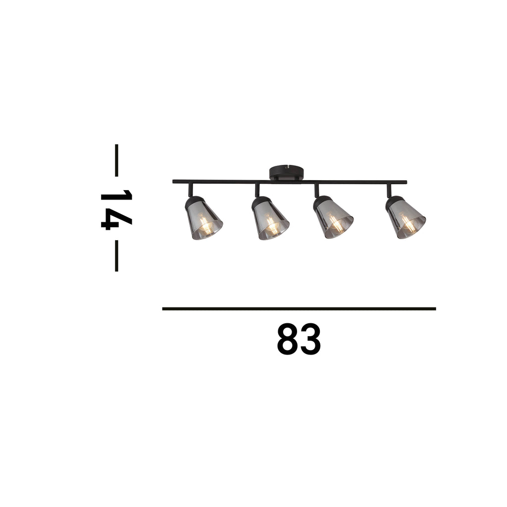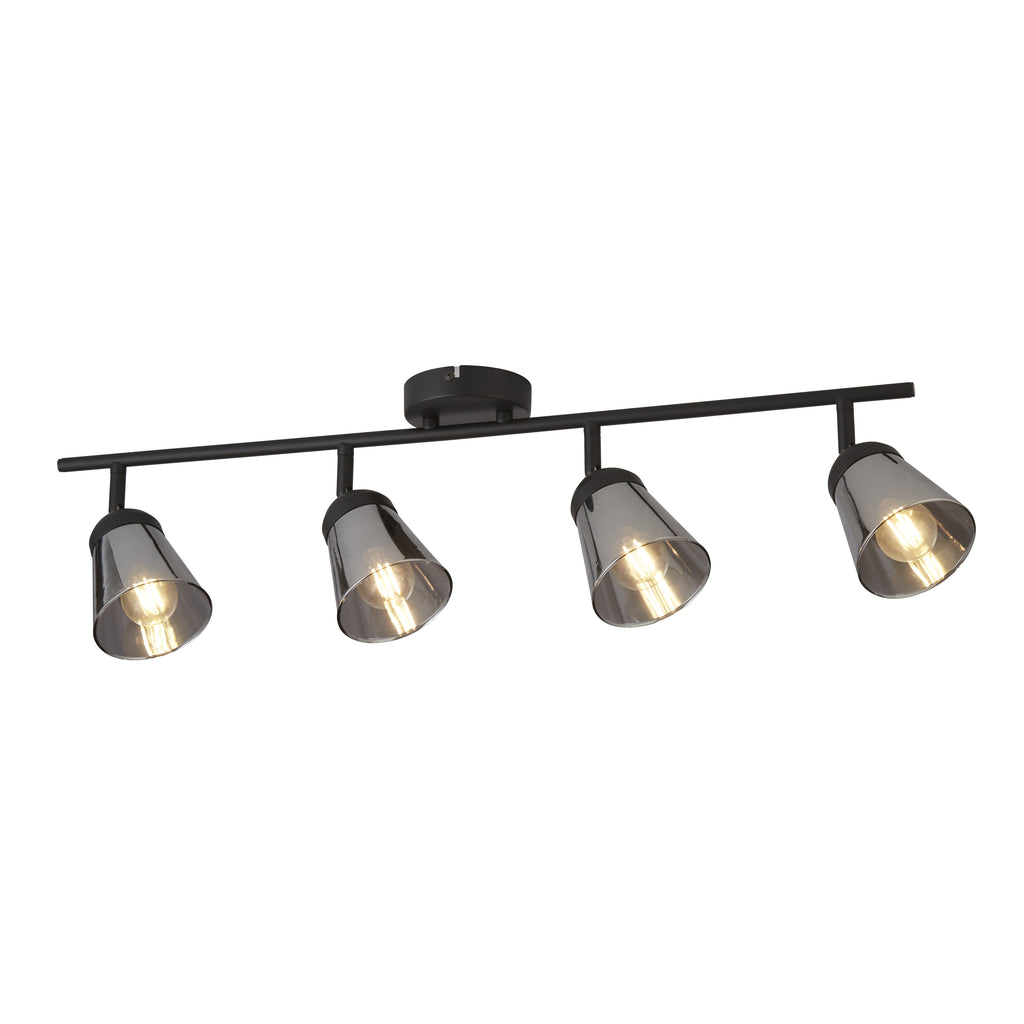 The Mega 4Light Bar Spotlight is a stylish and functional addition that adds a touch of modernity to any space. Made from durable black metal and smoked glass, it showcases a sleek and contemporary design that complements a wide range of interior design styles. With its smoked glass shades, the tinted and semi-transparent nature of the glass creates a sophisticated and modern aesthetic, making it an ideal choice for contemporary, industrial, or even vintage-inspired spaces. The 4 smoked glass shades are fully adjustable to direct light where needed, making this an ideal light for a living area or even kitchen.| Projection | 20.5cm/8.1" |