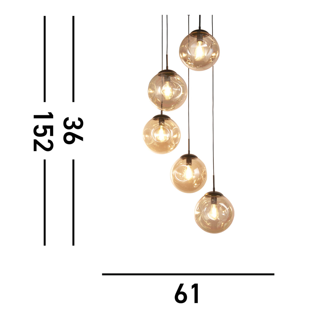 With its concave-shaped champagne glass, the Punch 5 light Multi-Drop Pendant exudes sophistication and elegance, making it a perfect addition to any living room or hallway. Crafted meticulously from durable black metal this 5 light pendant showcases stunning shades made of punched on trend champagne glass that add a touch of refinement to any space. The multi-drop design, featuring shades suspended at varying heights, creates a visually captivating centrepiece, and can be altered to fit the hight of any room.| Height | 152cm/59.8" |