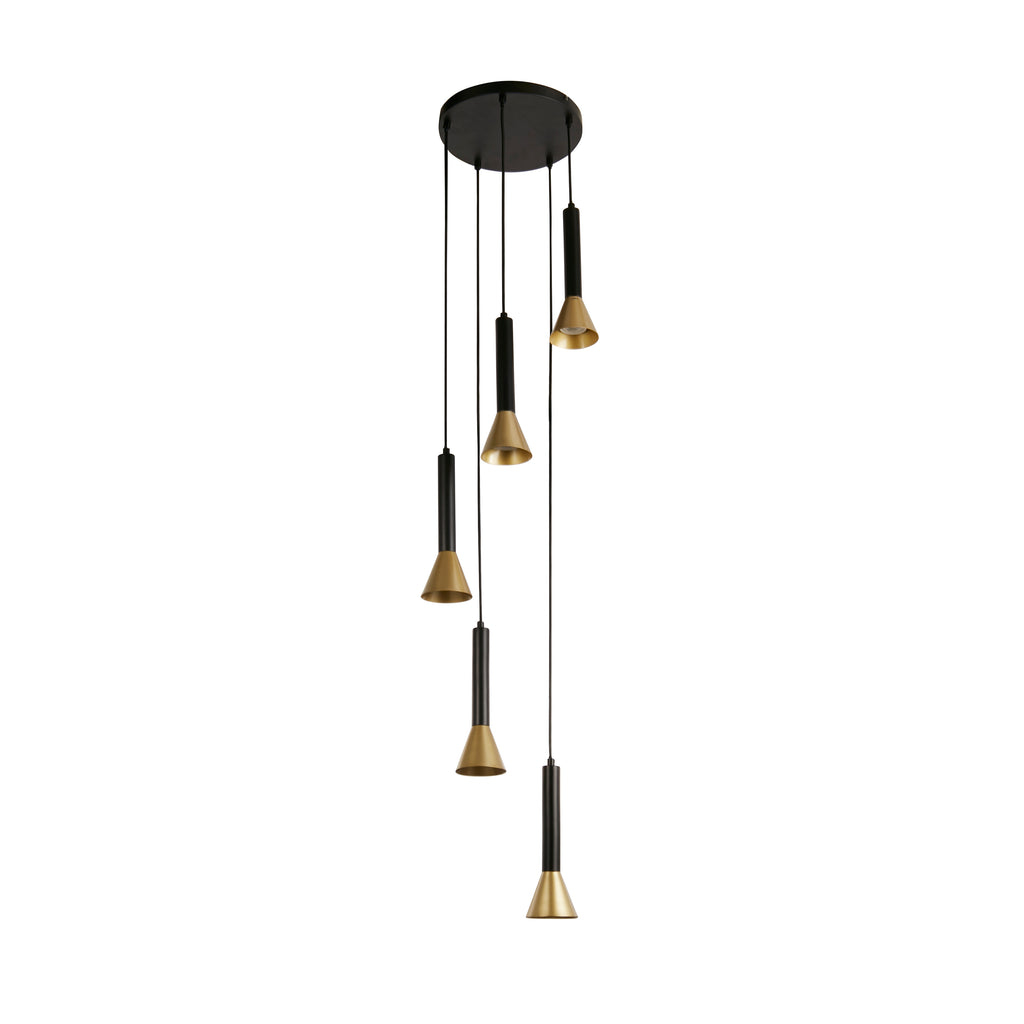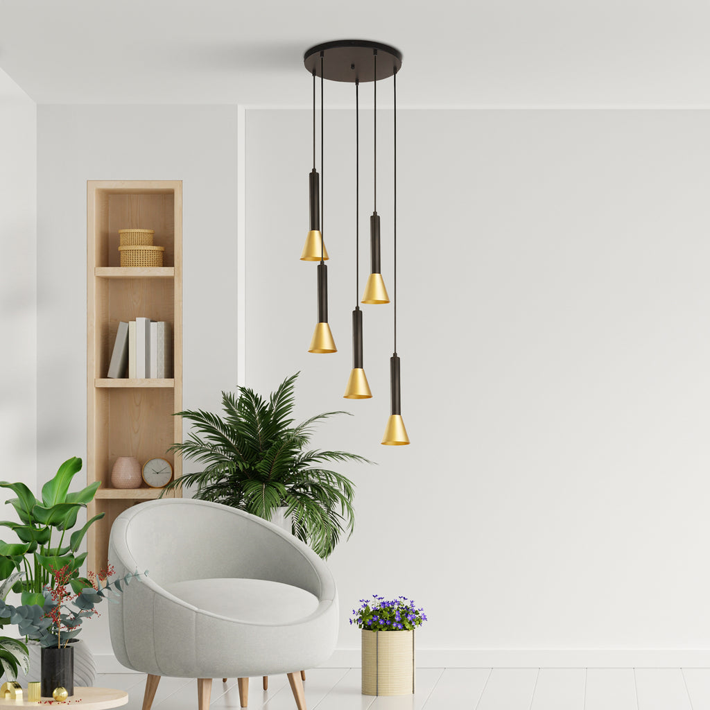 A beautiful lighting option for any room is the Signal 5LT Multi-drop Pendant in black and gold. It delivers focused illumination and draws attention to particular areas with its height-adjustable cone shade. This pendant's powder-coated satin construction perfectly blends classic and modern components. It's a great option for dining tables, kitchen islands, or reading nooks and is ideal for spotlighting important design aspects or fostering a cosy atmosphere.| Height | 150cm/59.1" |