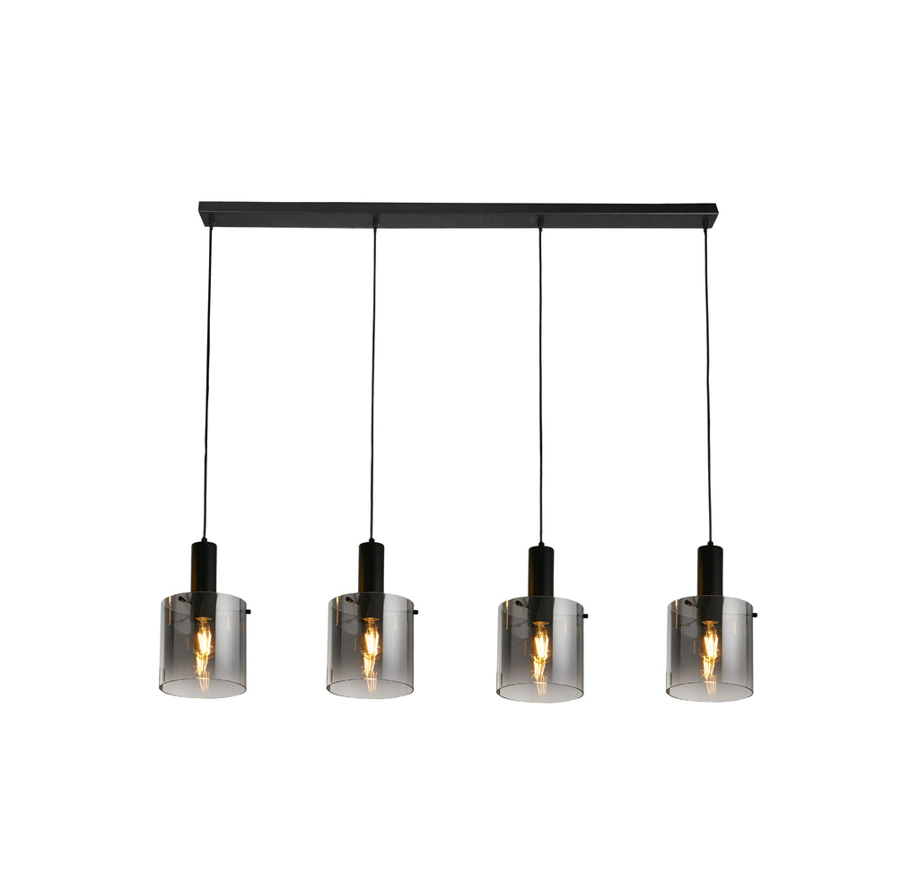 Featuring polished black glass, the Sweden 4Lt Bar Pendant will be a captivating addition to kitchens and living rooms. Crafted from black metal and glass, this pendant showcases 4 cylindrical shades in a mesmerising black smoked glass that complements contemporary interiors. Its adjustable height design offers customisable lighting to suit different ceiling heights. With its timeless elegance, including cylinder-shaped glass and classic black lamp holders, this pendant will enhance any space, adding a contemporary feel.| Height | 150cm/59.1" |