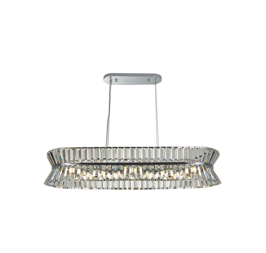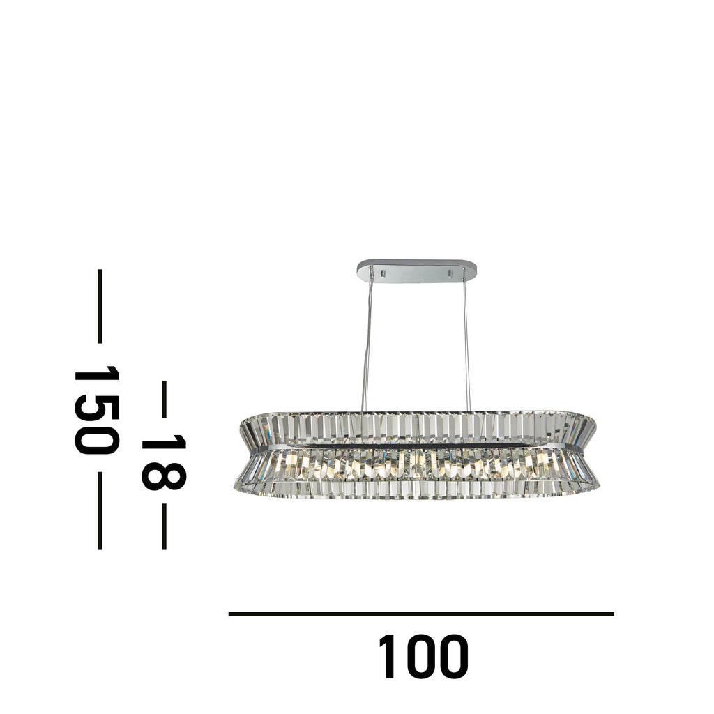 The Uptown 10Lt Oval Diner Pendant is a sophisticated lighting fixture perfect for any kitchen or dining room. Crafted with sleek chrome metal and with a multitude of clear crystal pieces, it will effortlessly enhance sophisticated modern interiors. Its oval and hourglass shape adorned with ridges and glazed finish, creates a mesmerising lighting effect that adds a touch of elegance to any space. The stunning clear crystal pieces will sparkle beautifully when lit, masking this pendant a stunning centrepiece to any home. With its stylish design and versatile functionality, it is a must-have addition to elevate your interior décor.| Height | 150cm/59.1" |