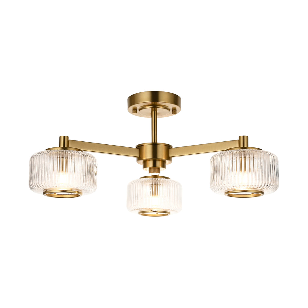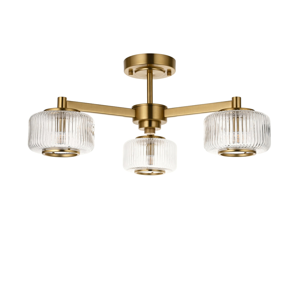 Stamford 3 Light Brass & Ribbed Glass Semi Flush