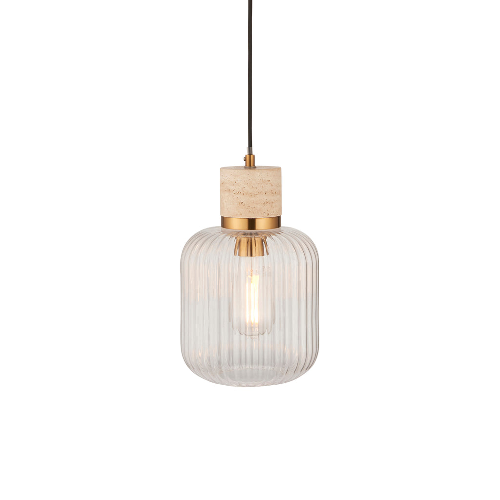 Travi Travertine Stone & Brass Pendant - Glass Ribbed Shade