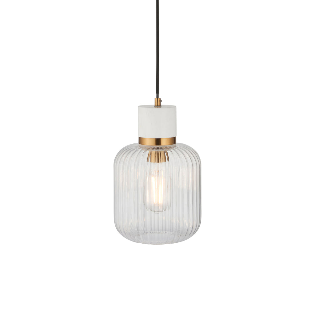 Infuse your space with contemporary sophistication using this single pendant light, crafted with rich materials and elegant form. A bold cylinder of white Volakas marble sits proudly above a brushed brass collar, suspending a softly curved clear ribbed glass shade that beautifully reveals the light source within. Finished with a coordinating brass ceiling rose and sleek black fabric flex, this pendant is perfect for adding a touch of modern luxury above kitchen islands, dining tables or in statement clusters. The contrasting tones of stone, metal and glass lend a timeless appeal with a modern edge.