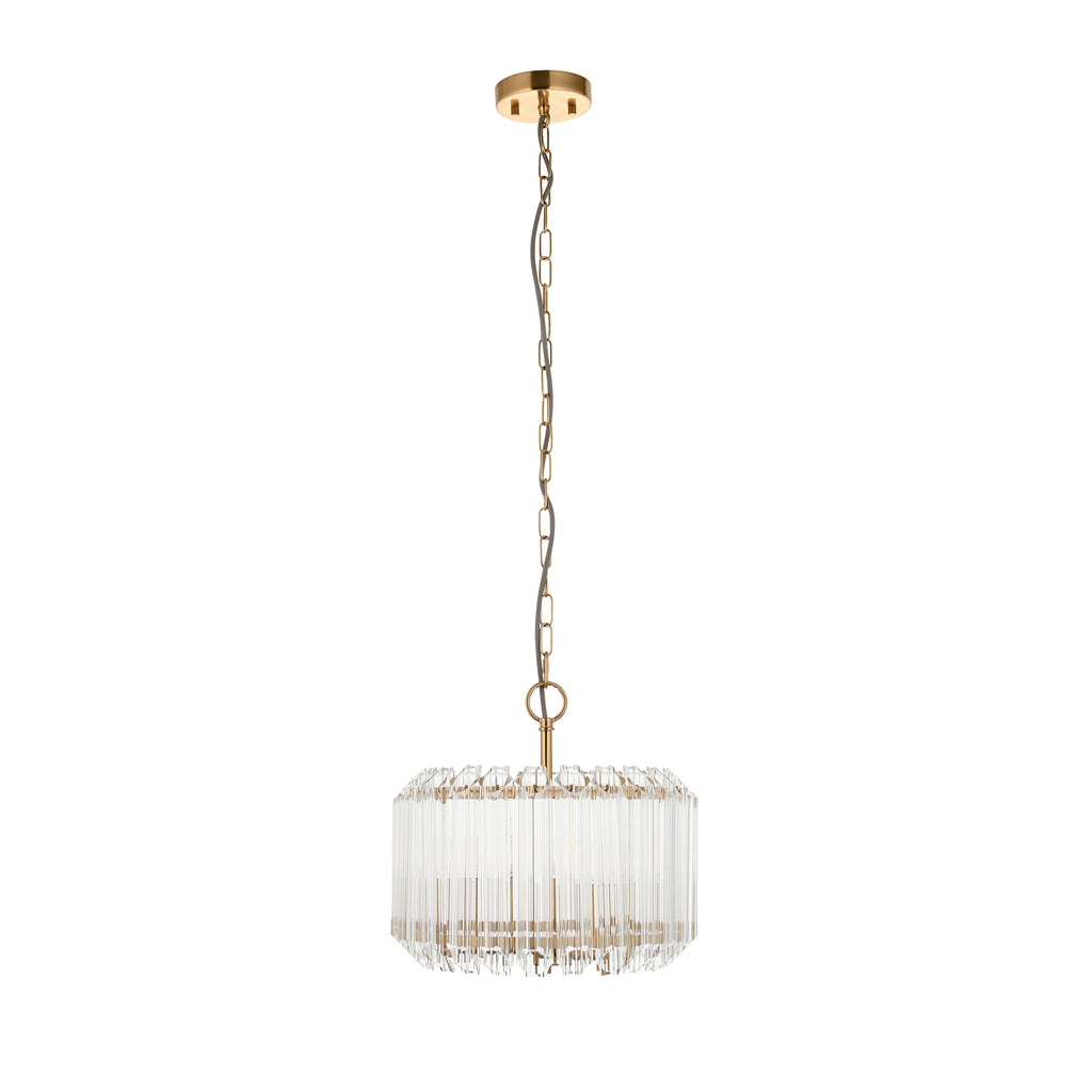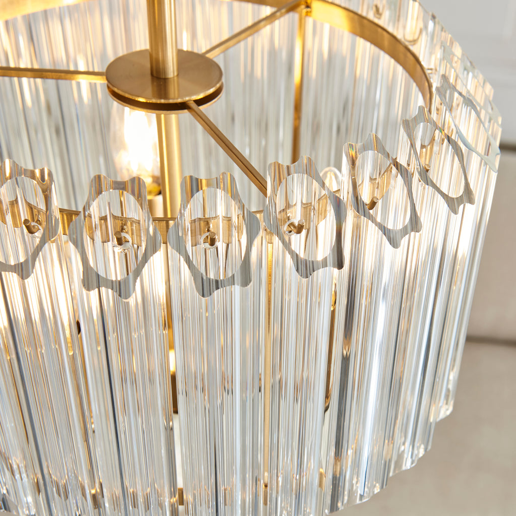 Elevate your space with this exquisite 3 light pendant, featuring a refined silhouette of tiered vertical clear glass rods encircling a warm brass frame. Suspended from a height-adjustable chain and finished with an elegant grey braided fabric flex, this piece brings a perfect balance of vintage glamour and modern sophistication. Ideal for dining areas, hallways, or grand entrances, it delivers a beautiful diffusion of light with a shimmering, ambient glow.