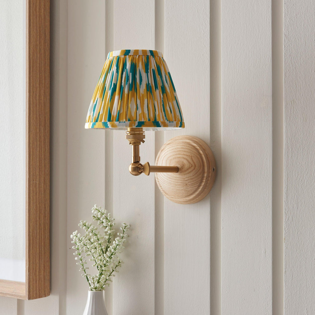 Introducing our exquisite natural Ash wood wall light, designed with a sleek linear arm and an adjustable knuckle that allows you to effortlessly angle the light for that timeless, classic aesthetic. This versatile piece is perfect for illuminating bedrooms, hallways, and lounge areas, adding a touch of elegance to any space. Complementing its stunning design, the wall light is finished in brushed aged brass, exuding warmth and sophistication. It comes complete with a vibrant 16cm Ikat shade in striking yellow and jade, making it a standout feature in your home decor. Enhance your living space even further with our coordinated bedroom lighting range, designed to create a harmonious and inviting atmosphere throughout your home. We prioritize your shopping experience, offering secure delivery and easy returns, so you can shop with confidence. Enjoy a safe online shopping experience and elevate your home with our beautiful lighting solutions today!| Projection | 22.5cm/8.9" |
